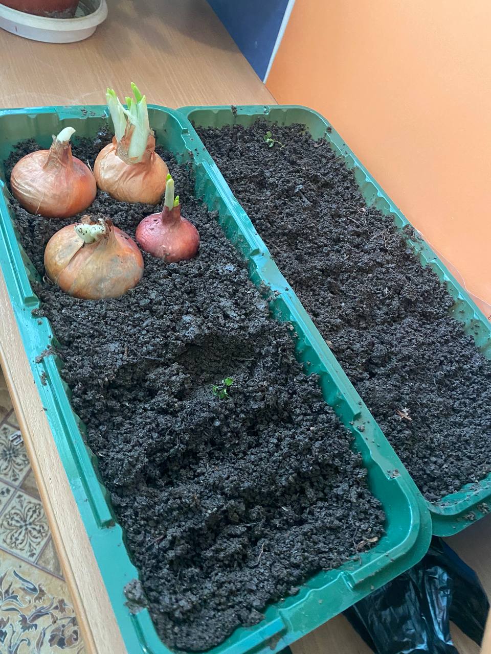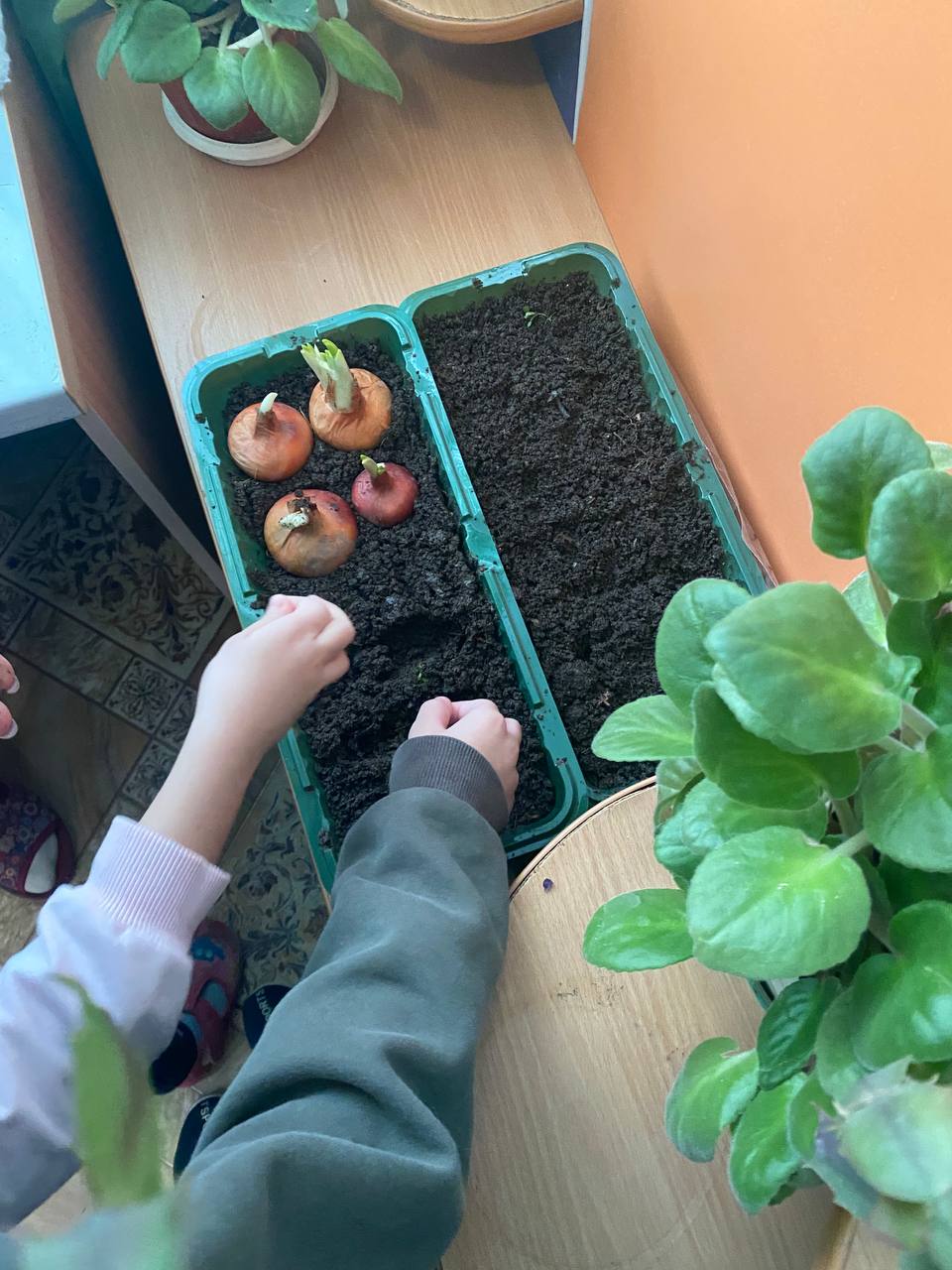 Подготовительная группа "Семицветики", поработали сегодня в уголке природы и создали свой небольшой огород под названием "Чудо огород" (мы сажали огород, что там только не растёт). Ребята с большим удовольствием посадили лук, посеяли семена салатных листьев, а также посеяли семена цветов ( петуньи, чернобрывцы). Юные любители природы узнали много интересного о свойствах и полезных качествах лука. Вот мы какие! Юные огородники!